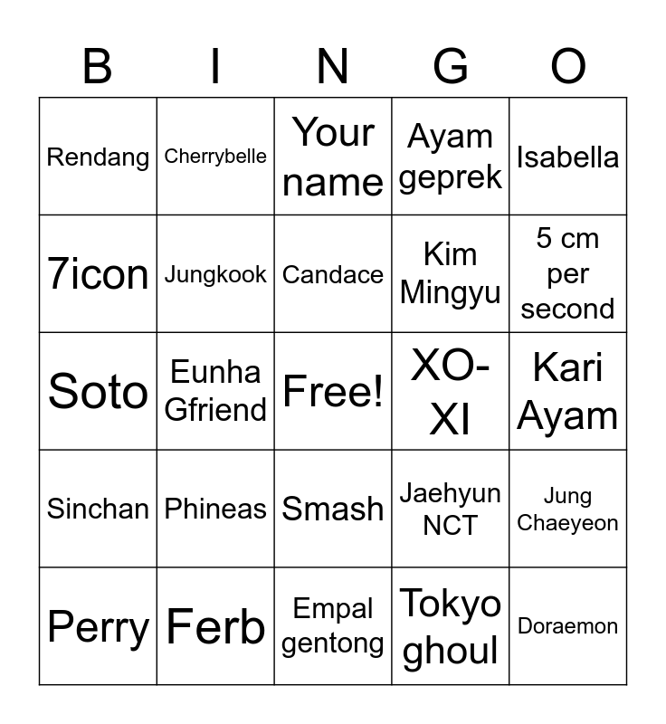 This bingo card has a free space and 24 words: Phineas, Ferb, Candace, Perry, Isabella, Rendang, 7icon, Cherrybelle, XO-XI, Smash, Kim Mingyu, Soto, Jaehyun NCT, Jung Chaeyeon, Jungkook, Tokyo ghoul, Kari Ayam, Your name, 5 cm per second, Eunha Gfriend, Doraemon, Sinchan, Ayam geprek and Empal gentong.