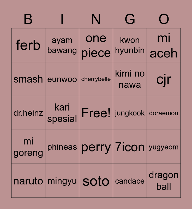 This bingo card has a free space and 24 words: phineas, mingyu, cherrybelle, naruto, mi aceh, ferb, smash, ayam bawang, jungkook, perry, kimi no nawa, dr.heinz, 7icon, yugyeom, eunwoo, candace, doraemon, one piece, cjr, kari spesial, dragon ball, mi goreng, kwon hyunbin and soto.