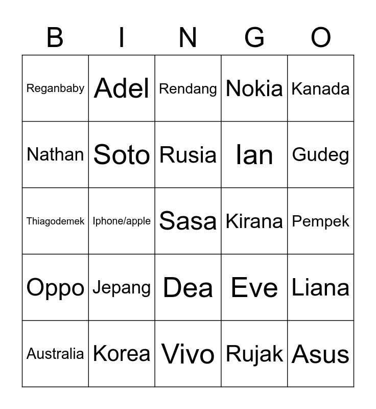 This bingo card has a free space and 24 words: Jepang, Korea, Rusia, Australia, Kanada, Reganbaby, Nathan, Adel, Kirana, Dea, Ian, Thiagodemek, Eve, Liana, Soto, Rujak, Pempek, Rendang, Gudeg, Iphone/apple, Asus, Oppo, Nokia and Vivo.