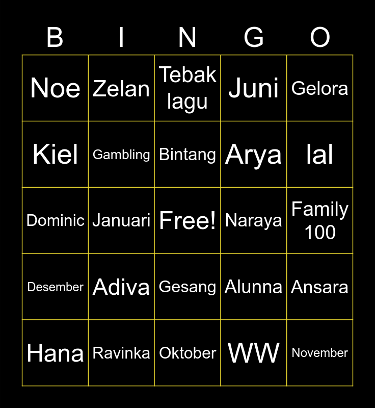 This bingo card has a free space and 24 words: Adiva, Ravinka, Bintang, Hana, Gelora, Noe, Kiel, Zelan, Naraya, Gesang, Arya, Dominic, Alunna, Ansara, Gambling, WW, Family 100, Tebak lagu, lal, Januari, November, Desember, Juni and Oktober.