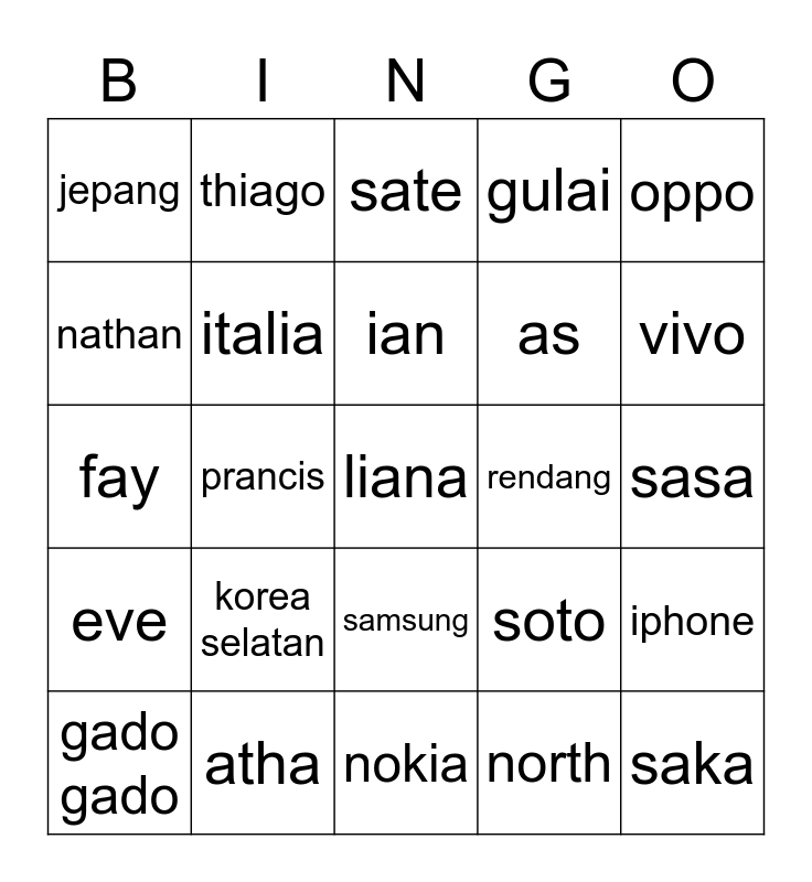 This bingo card has a free space and 24 words: korea selatan, atha, ian, gado gado, oppo, jepang, nathan, thiago, rendang, samsung, as, fay, soto, iphone, italia, north, sasa, sate, vivo, prancis, saka, eve, gulai and nokia.