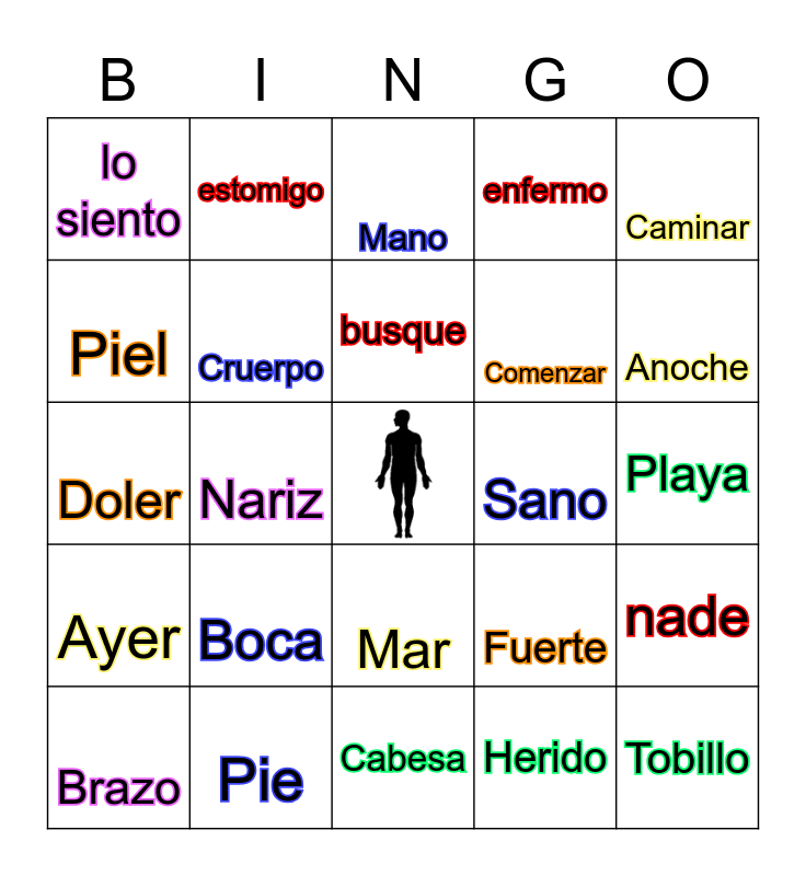 This bingo card has a free space and 29 words: Brazo, Ojo, Nariz, Sano, lo siento, Mano, Cruerpo, Boca, Sano, Pie, Playa, Tobillo, Cabesa, Herido, Anoche, Rodilla, Mar, Ayer, Caminar, Doler, Fuerte, Bucear, Comenzar, Piel, enfermo, estomigo, nade, busque and rodilla.