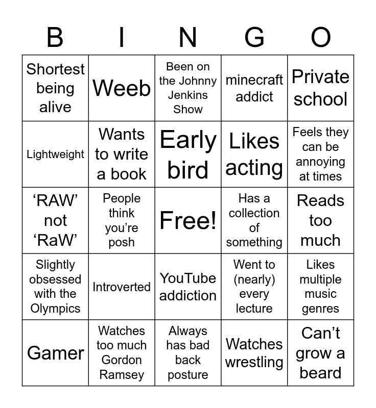 This bingo card has a free space and 24 words: Introverted, Watches too much Gordon Ramsey, Early bird, Gamer, Private school, Shortest being alive, Lightweight, Weeb, Has a collection of something, YouTube addiction, Likes acting, ‘RAW’ not ‘RaW’, Went to (nearly) every lecture, Likes multiple music genres, Wants to write a book, Watches wrestling, Reads too much, Been on the Johnny Jenkins Show, Feels they can be annoying at times, People think you’re posh, Can’t grow a beard, Slightly obsessed with the Olympics, minecraft addict and Always has bad back posture.