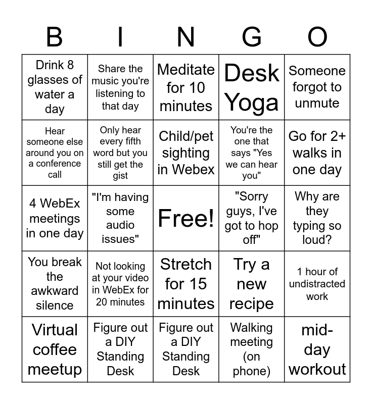 This bingo card has a free space and 24 words: Not looking at your video in WebEx for 20 minutes, Figure out a DIY Standing Desk, Child/pet sighting in Webex, Virtual coffee meetup, Someone forgot to unmute, Drink 8 glasses of water a day, Hear someone else around you on a conference call, Share the music you're listening to that day, "Sorry guys, I've got to hop off", Stretch for 15 minutes, You're the one that says "Yes we can hear you", 4 WebEx meetings in one day, Try a new recipe, 1 hour of undistracted work, Only hear every fifth word but you still get the gist, Walking meeting (on phone), Why are they typing so loud?, Meditate for 10 minutes, Go for 2+ walks in one day, "I'm having some audio issues", mid-day workout, You break the awkward silence, Desk Yoga and Figure out a DIY Standing Desk.