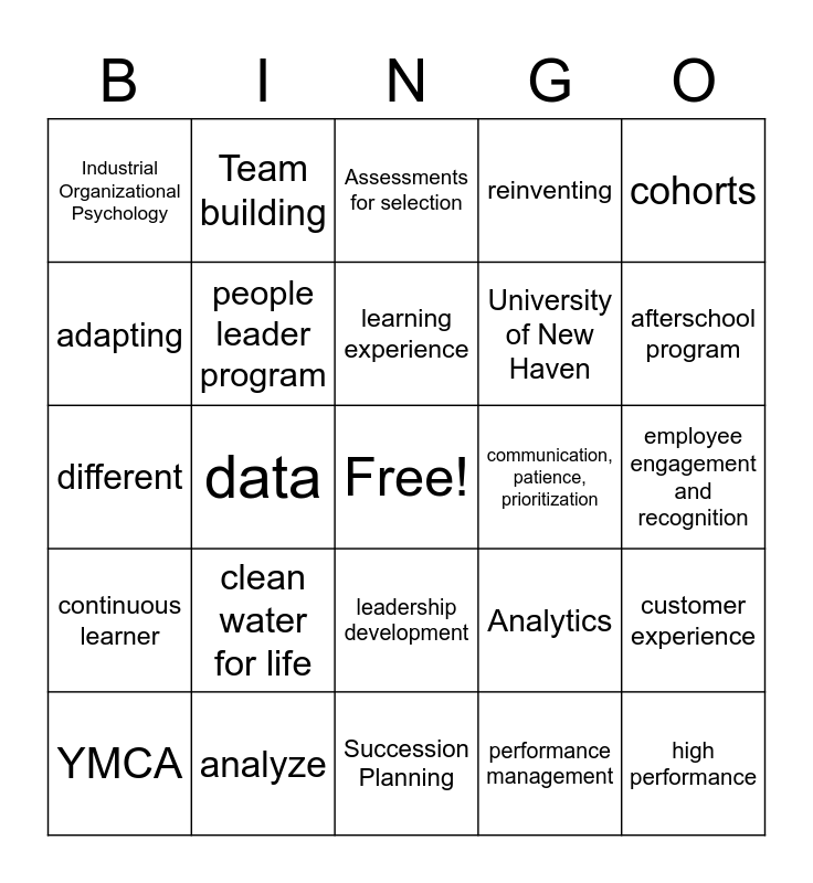 This bingo card has a free space and 31 words: Succession Planning, top leader coaching, data, continuous feedback, Industrial Organizational Psychology, Assessments for selection, people leader program, Analytics, communication, patience, prioritization, performance management, employee engagement and recognition, high performance, Assessments for development, employee experience, afterschool program, Change Management, customer experience, clean water for life, continuous learner, leadership development, cohorts, myVoice culture survey, YMCA, Team building, University of New Haven, adapting, reinventing, different, analyze, learning experience and trends.