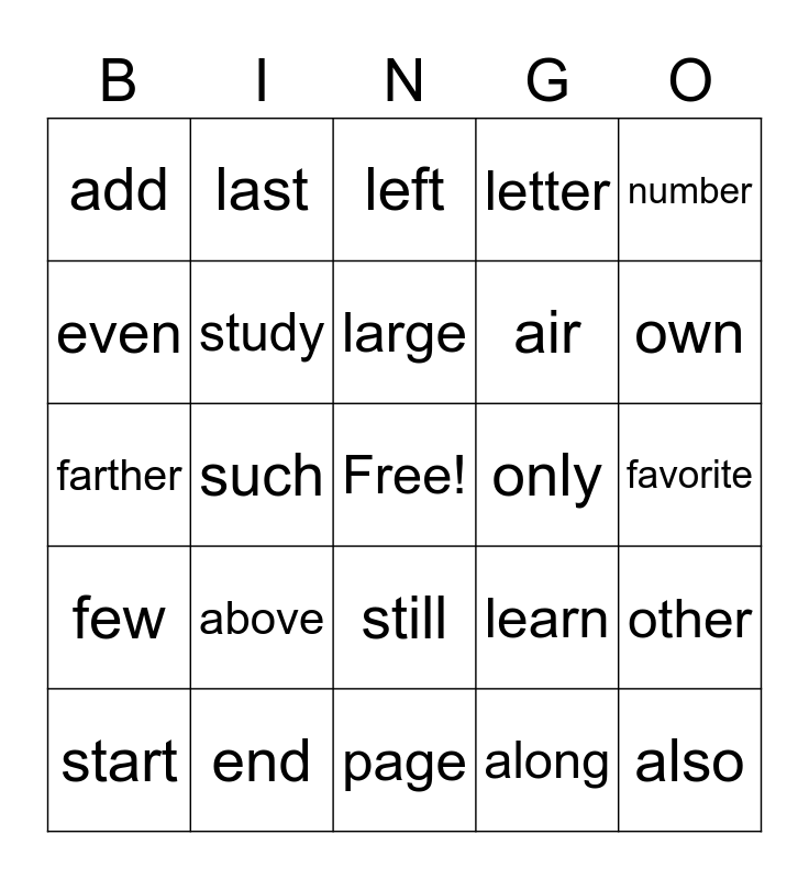 This bingo card has a free space and 24 words: above, end, large, start, number, add, even, last, only, still, air, farther, learn, other, study, along, favorite, left, own, such, also, few, letter and page.
