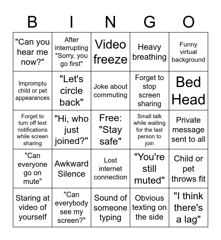 This bingo card has a free space and 24 words: Awkward Silence, "Can everybody see my screen?", Joke about commuting, Staring at video of yourself, Funny virtual background, "Can you hear me now?", Impromptu child or pet appearances, After interrupting "Sorry, you go first", Small talk while waiting for the last person to join, Lost internet connection, Forget to stop screen sharing, Forget to turn off text notifications while screen sharing, "You're still muted", Child or pet throws fit, "Let's circle back", Obvious texting on the side, Private message sent to all, Video freeze, Bed Head, "Hi, who just joined?", "I think there's a lag", "Can everyone go on mute", Heavy breathing and Sound of someone typing.