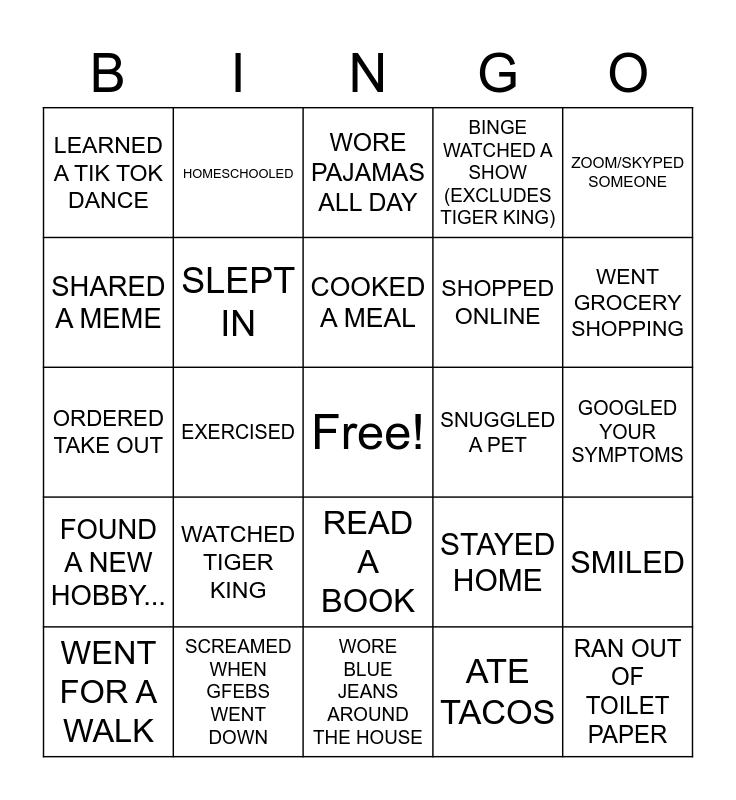 This bingo card has a free space and 24 words: WATCHED TIGER KING, SCREAMED WHEN GFEBS WENT DOWN, COOKED A MEAL, WENT FOR A WALK, ZOOM/SKYPED SOMEONE, LEARNED A TIK TOK DANCE, SHARED A MEME, HOMESCHOOLED, SNUGGLED A PET, READ A BOOK, SHOPPED ONLINE, ORDERED TAKE OUT, STAYED HOME, SMILED, SLEPT IN, ATE TACOS, GOOGLED YOUR SYMPTOMS, WORE PAJAMAS ALL DAY, WENT GROCERY SHOPPING, EXERCISED, RAN OUT OF TOILET PAPER, FOUND A NEW HOBBY..., BINGE WATCHED A SHOW (EXCLUDES TIGER KING) and WORE BLUE JEANS AROUND THE HOUSE.