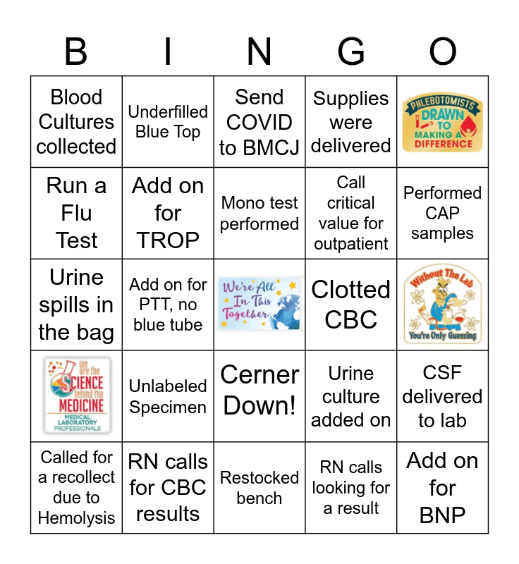 This bingo card has 4 images, a free space and 25 words: RN calls for CBC results, Send COVID to BMCJ, Called to cancel test, Blood Cultures collected, Add on for TROP, Mono test performed, Clotted CBC, CSF delivered to lab, Called for a recollect due to Hemolysis, Add on for PTT, no blue tube, RN calls looking for a result, Add on for BNP, Urine spills in the bag, Created transfer list for Labcorp, Restocked bench, Urine culture added on, Performed CAP samples, Unlabeled Specimen, Performed QC, Call critical value for outpatient, Run a Flu Test, Underfilled Blue Top, Cerner Down!, Supplies were delivered and Non-lab team member said Happy Lab Week.