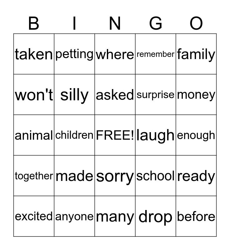 This bingo card has a free space and 28 words: ready, games, surprise, drop, won't, where, petting, together, laugh, excited, animal, remember, anyone, many, money, teacher, made, silly, asked, sorry, taken, waited, before, children, enough, school, family and found.