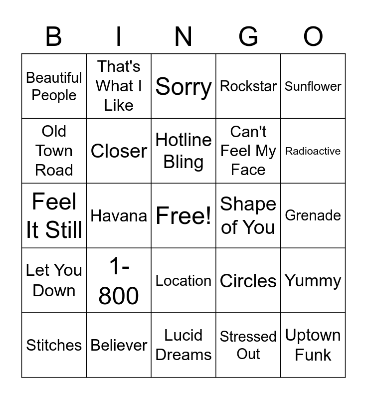 This bingo card has a free space and 24 words: 1-800, Believer, Hotline Bling, Stitches, Sunflower, Beautiful People, Old Town Road, That's What I Like, Shape of You, Location, Can't Feel My Face, Feel It Still, Circles, Yummy, Closer, Stressed Out, Grenade, Sorry, Radioactive, Havana, Uptown Funk, Let You Down, Rockstar and Lucid Dreams.