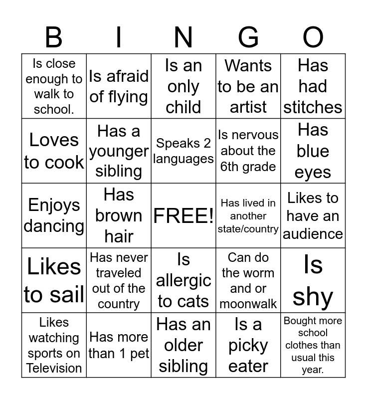 This bingo card has a free space and 24 words: Has never traveled out of the country, Has more than 1 pet, Speaks 2 languages, Likes watching sports on Television, Has had stitches, Is close enough to walk to school., Loves to cook, Is afraid of flying, Has lived in another state/country, Is allergic to cats, Is nervous about the 6th grade, Enjoys dancing, Can do the worm and or moonwalk, Is shy, Has a younger sibling, Is a picky eater, Likes to have an audience, Is an only child, Has blue eyes, Has brown hair, Bought more school clothes than usual this year., Likes to sail, Wants to be an artist and Has an older sibling.