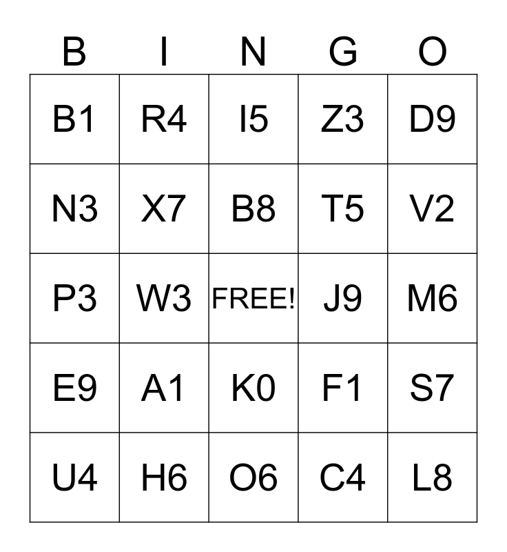 This bingo card has a free space and 24 words: A1, H6, B8, U4, D9, B1, N3, R4, J9, K0, T5, P3, F1, S7, X7, C4, M6, I5, V2, W3, L8, E9, Z3 and O6.
