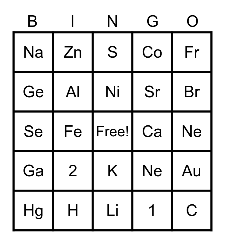 This bingo card has a free space and 29 words: Hg, 3, Fe, Cs, Na, S, Al, 2, Ca, H, Ne, C, Li, 1, Br, P, K, Ga, Fr, Se, Ne, He, Sr, Ge, Co, Zn, Au, Ni and Pb.