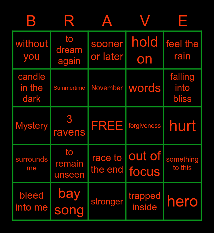 This bingo card has a free space and 41 words: I will wait, Mystery, 1000 miles of sand no gravity, Summertime, bay song, race to the end, November, electric ravens, feel the rain, surrounds me, 3 ravens, hold on, hero, hurt, forgiveness, to remain unseen, sleepless, without you, here, sooner or later, something to this, driven, stronger, words, broken dont go away, passages, trapped inside, escape, falling into bliss, i believe, before nightfall, to dream again, bleed into me, new beginning, out of focus, candle in the dark, waiting all this time, spirit, dark waters, lost (in retrospect) and to search a soul.