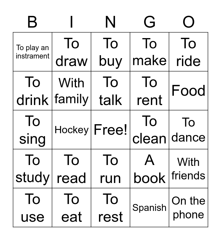 This bingo card has a free space and 24 words: To read, To eat, To talk, To use, To ride, To play an instrament, To drink, To draw, To clean, To run, To rent, To sing, A book, With friends, With family, Spanish, To dance, To buy, Food, Hockey, On the phone, To study, To make and To rest.