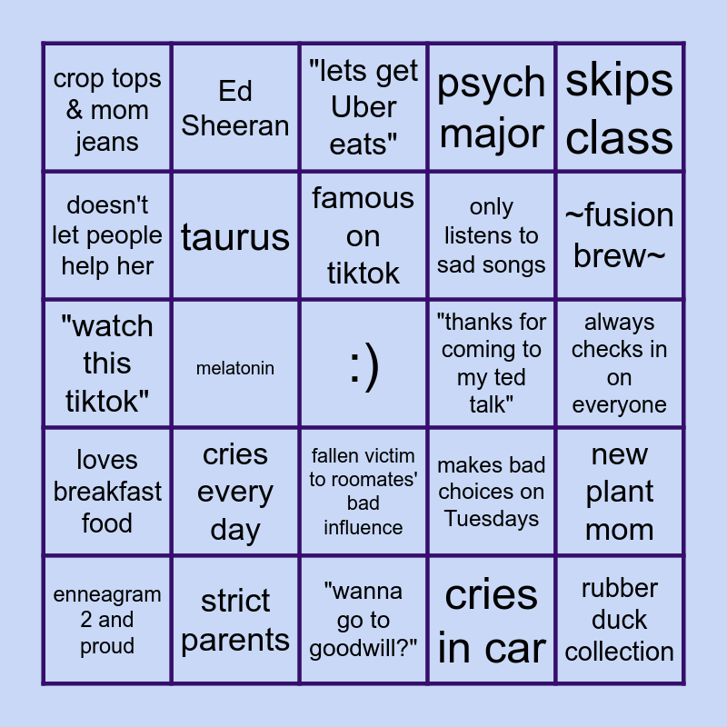 This bingo card has a free space and 24 words: cries every day, strict parents, famous on tiktok, enneagram 2 and proud, skips class, crop tops & mom jeans, doesn't let people help her, Ed Sheeran, "thanks for coming to my ted talk", fallen victim to roomates' bad influence, only listens to sad songs, "watch this tiktok", makes bad choices on Tuesdays, new plant mom, taurus, cries in car, always checks in on everyone, "lets get Uber eats", ~fusion brew~, melatonin, rubber duck collection, loves breakfast food, psych major and "wanna go to goodwill?".