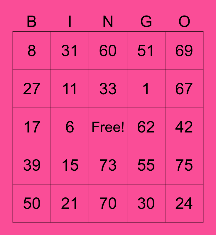 This bingo card has a free space and 24 words: 15, 21, 33, 50, 69, 8, 27, 31, 62, 73, 1, 17, 55, 75, 11, 30, 42, 60, 67, 6, 24, 39, 51 and 70.