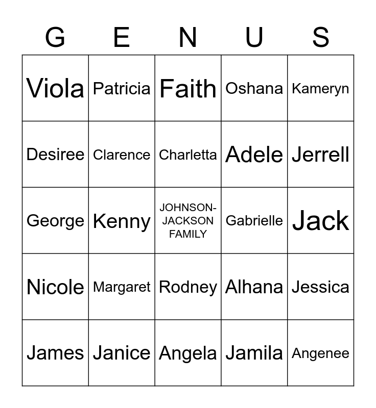 This bingo card has a free space and 86 words: Mildred, Charles, Charletta, Courtney, Shaquille, Papa CJ, Ernest, Eric, Corey, Darryln, Honey, Julius, Carey, Jack, Calvin, Margaret, Rodney, Bryanna, Rodney Jr, Cline, Beryl (BJ), Rose, Gabrielle, Eric Jr, James, Bertram, Joanne (Jo), Gabriel, Erica, Eunice, Janice, Alex, Darryln, Jessica, Viola, Sharon, Faith, Shaquill, Lacrecia (Crese), George, Hopie, Tiffany, Dion, Jerrell, Janelle, Kenny, Irene Yvette, Oshana, Khalid, Andrew, Sandra, LaShann, Jamila, Gavin, Errol, Joetta, Antoine, Adele, Kameryn, Desiree, Patricia, Kevin, Aniston, Ciera, Anthony, Clarence, Marques, Alhana, Angenee, Sydney, Sandra, Stephanie, Johnny, Roanna, Christina, Tobias, Angela, Tony, Charisa, Mychal, Asia, Felecia, Michael, EJ, Nicole and Chris.