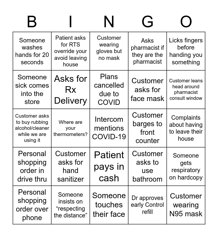 This bingo card has a free space and 27 words: Customer asks to use bathroom, Someone wears mask incorrectly, Customer asks for face mask, Someone touches their face, Someone sick comes into the store, Customer wearing gloves but no mask, Patient asks for RTS override your avoid leaving house, Personal shopping order in drive thru, Customer barges to front counter, Someone gets respiratory on hardcopy, Customer asks to buy rubbing alcohol/cleaner while we are using it, Asks pharmacist if they are the pharmacist, Personal shopping order over phone, Someone insists on “respecting the distance”, Customer leans head around pharmacist consult window, Someone pulls down their mask to talk to you, Asks for Rx Delivery, Plans cancelled due to COVID, Customer asks for hand sanitizer, Someone washes hands for 20 seconds, Complaints about having to leave their house, Dr approves early Control refill, Where are your thermometers?, Customer wearing N95 mask, Patient pays in cash, Licks fingers before handing you something and Patient gives unsolicited advice.