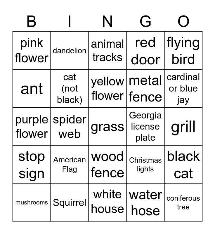 This bingo card has a free space and 24 words: American Flag, Squirrel, yellow flower, mushrooms, flying bird, pink flower, ant, dandelion, Georgia license plate, wood fence, metal fence, purple flower, Christmas lights, black cat, cat (not black), water hose, grill, animal tracks, cardinal or blue jay, spider web, coniferous tree, stop sign, red door and white house.