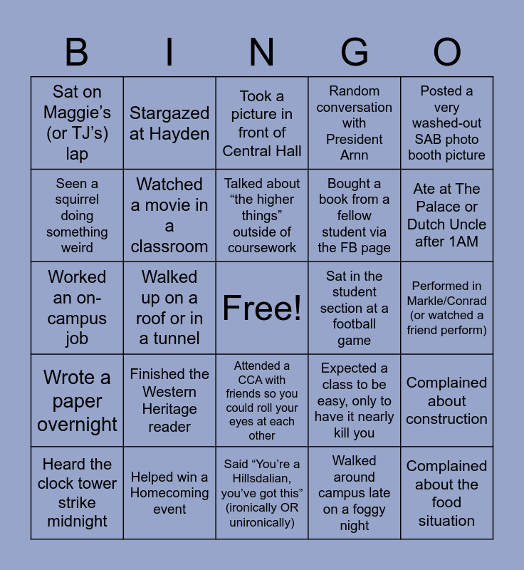 This bingo card has a free space and 24 words: Finished the Western Heritage reader, Helped win a Homecoming event, Talked about “the higher things” outside of coursework, Heard the clock tower strike midnight, Posted a very washed-out SAB photo booth picture, Sat on Maggie’s (or TJ’s) lap, Seen a squirrel doing something weird, Stargazed at Hayden, Sat in the student section at a football game, Attended a CCA with friends so you could roll your eyes at each other, Bought a book from a fellow student via the FB page, Worked an on-campus job, Expected a class to be easy, only to have it nearly kill you, Complained about construction, Watched a movie in a classroom, Walked around campus late on a foggy night, Performed in Markle/Conrad (or watched a friend perform), Took a picture in front of Central Hall, Ate at The Palace or Dutch Uncle after 1AM, Walked up on a roof or in a tunnel, Complained about the food situation, Wrote a paper overnight, Random conversation with President Arnn and Said “You’re a Hillsdalian, you’ve got this” (ironically OR unironically).