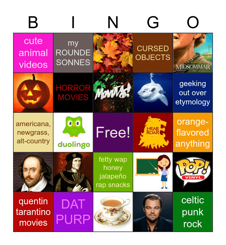 This bingo card has 13 images, a free space and 11 words: DAT PURP, quentin tarantino movies, cute animal videos, my ROUNDE SONNES, fetty wap honey jalapeño rap snacks, americana, newgrass, alt-country, HORROR MOVIES, orange-flavored anything, geeking out over etymology, celtic punk rock and CURSED OBJECTS.