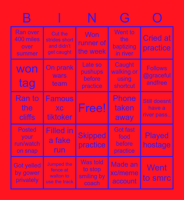 This bingo card has a free space and 24 words: Filled in a fake run, Jumped the fence at walton to use the track, Late so pushups before practice, Got yelled by gower privately, Cried at practice, Ran over 400 miles over summer, won tag, Cut the strides short and didn’t get caught, Phone taken away, Skipped practice, Caught walking or using shortcut, Ran to the cliffs, Got fast food before practice, Played hostage, On prank wars team, Made an xc/meme account, Still doesnt have a river pass.., Won runner of the week, Follows @graceful andfree, Famous xc tiktoker, Went to smrc, Posted your run/watch on snap, Went to the baptizing in river and Was told to stop smiling by coach.