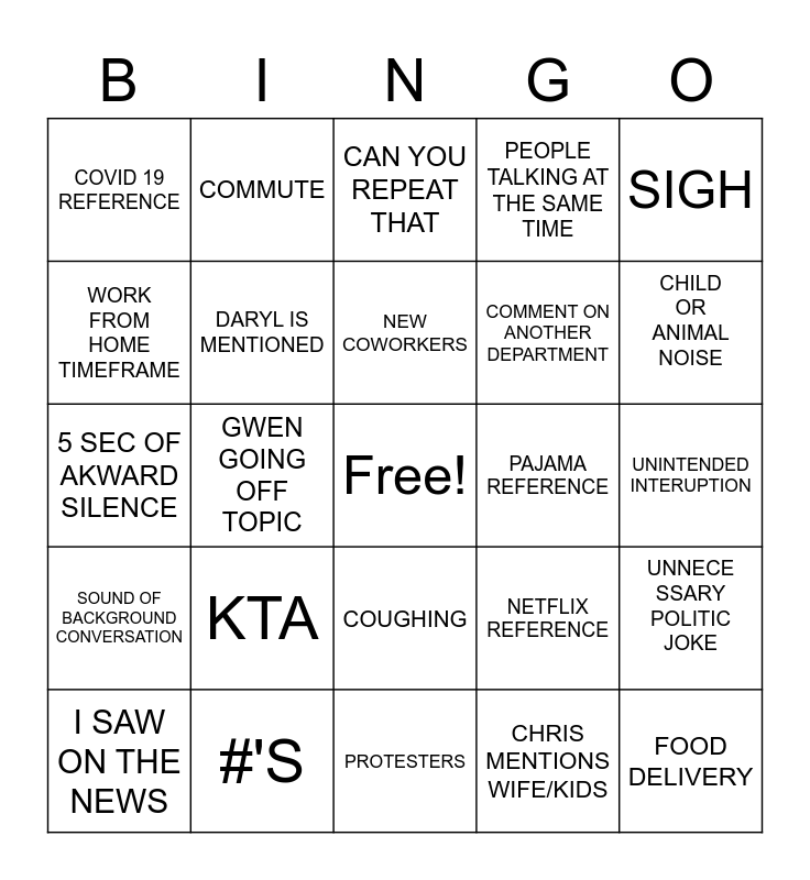 This bingo card has a free space and 24 words: KTA, #'S, NEW COWORKERS, I SAW ON THE NEWS, SIGH, COVID 19 REFERENCE, WORK FROM HOME TIMEFRAME, COMMUTE, PAJAMA REFERENCE, COUGHING, COMMENT ON ANOTHER DEPARTMENT, 5 SEC OF AKWARD SILENCE, NETFLIX REFERENCE, UNNECE SSARY POLITIC JOKE, DARYL IS MENTIONED, CHRIS MENTIONS WIFE/KIDS, UNINTENDED INTERUPTION, CAN YOU REPEAT THAT, CHILD OR ANIMAL NOISE, GWEN GOING OFF TOPIC, FOOD DELIVERY, SOUND OF BACKGROUND CONVERSATION, PEOPLE TALKING AT THE SAME TIME and PROTESTERS.