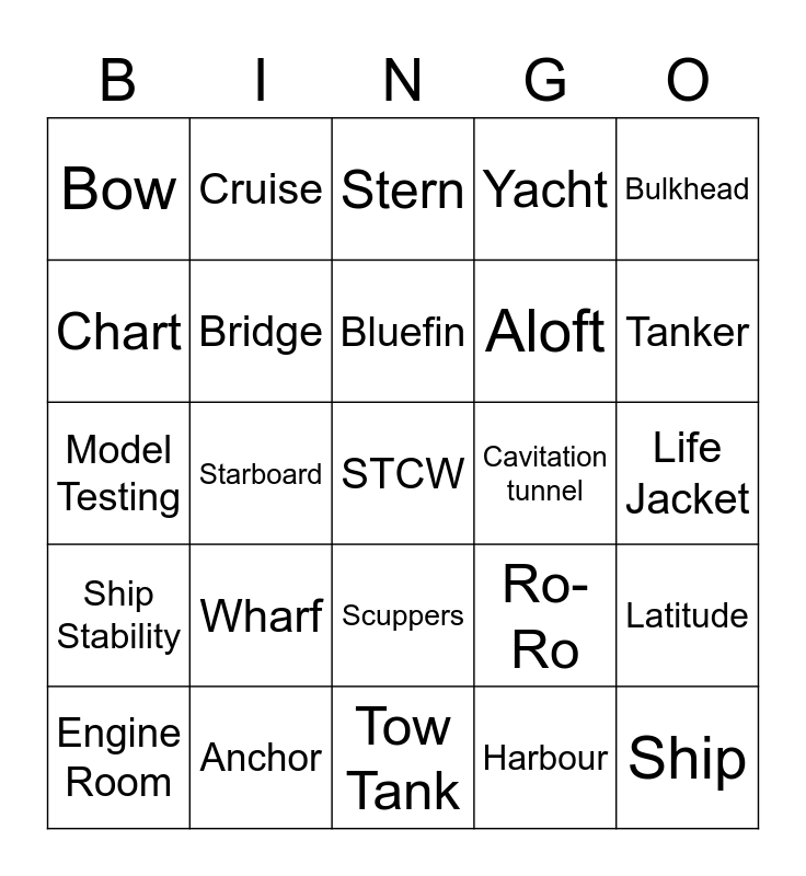 This bingo card has 70 words: Free!, Life Jacket, Lighthouse, Signal Flags, Anchor, Compass, Yacht, Dinghy, Bulkhead, Deck, Latitude, Longitude, Bow, Stern, Port, Starboard, Scuppers, Aloft, Rigging, Ship Stability, Cavitation tunnel, Ro-Ro, Tanker, Nautical Mile, Waypoint, Wake, Lifesaver, Buoy, Harbour, Channel marker, Cruise, Coast, Offshore, MARPOL, IMO, Inshore, Bill of Lading, Charter Parties, Beach, Chart, Ship, Wharf, STCW, COL REGS, Chain, Bridge, Engine Room, Bareboat Charter, Ships Agent, Seafarer, Engineer, Naval Architecture, Ocean Engineering, Deckie, Tow Tank, Model Test Basin, Bluefin, Logistics, Coxswain, Hydrostatics, Model Testing, EPIRB, Time Charter, Maritime Law, ECDIS, Pilot, Tug Boat, Bridge Simulator, Tall Ship and Engine Room Simulator.