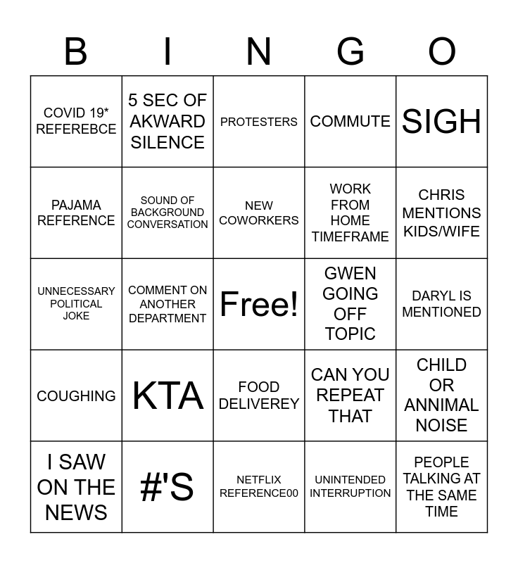 This bingo card has a free space and 24 words: KTA, #'S, NEW COWORKERS, I SAW ON THE NEWS, SIGH, COVID 19* REFEREBCE, PAJAMA REFERENCE, 5 SEC OF AKWARD SILENCE, GWEN GOING OFF TOPIC, FOOD DELIVEREY, WORK FROM HOME TIMEFRAME, UNNECESSARY POLITICAL JOKE, CAN YOU REPEAT THAT, CHILD OR ANNIMAL NOISE, SOUND OF BACKGROUND CONVERSATION, UNINTENDED INTERRUPTION, DARYL IS MENTIONED, PROTESTERS, CHRIS MENTIONS KIDS/WIFE, COMMENT ON ANOTHER DEPARTMENT, PEOPLE TALKING AT THE SAME TIME, COUGHING, COMMUTE and NETFLIX REFERENCE00.