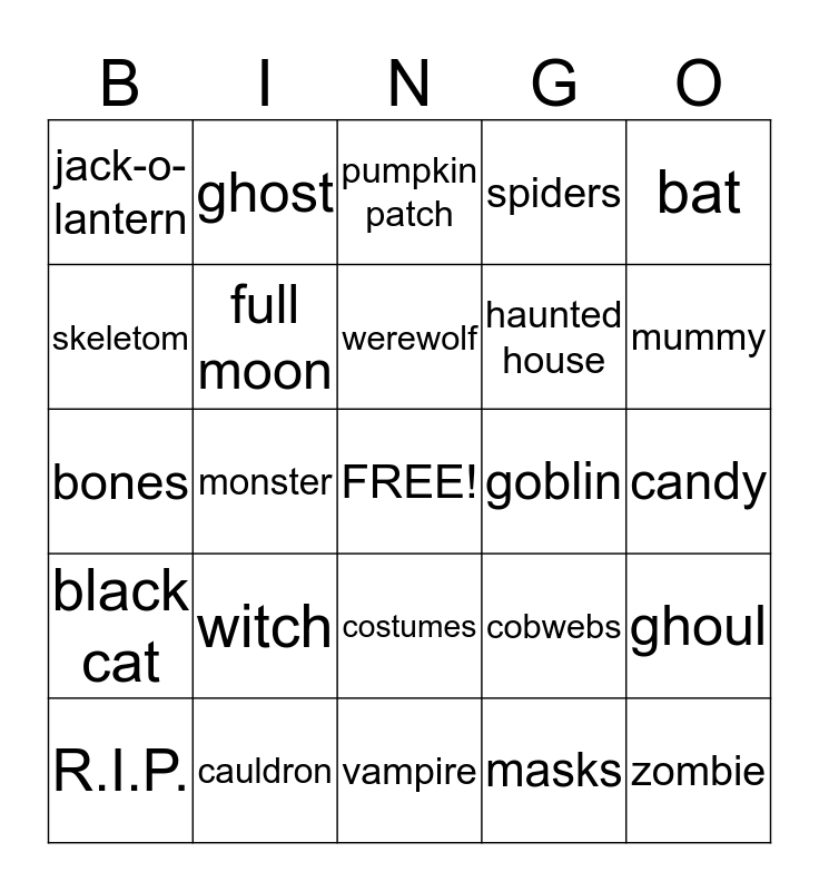 This bingo card has a free space and 24 words: witch, cauldron, werewolf, R.I.P., bat, jack-o-lantern, skeletom, ghost, goblin, costumes, haunted house, bones, cobwebs, ghoul, full moon, masks, candy, pumpkin patch, mummy, monster, zombie, black cat, spiders and vampire.