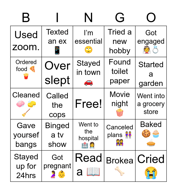 This bingo card has a free space and 24 words: Binged a tv show, Got pregnant ๐คฐ๐ถ, Stayed in town ๐, Stayed up for 24hrs, Got engaged ๐ฐ๐, Used zoom., Ordered food ๐๐, Texted an ex ๐ฑ, Movie night ๐ฟ, Went to the hospital ๐ฅ๐ฉโโ๏ธ, Found toilet paper, Cleaned ๐งผ ๐งฝ ๐งน, Canceled plans ๐ญ ๐ฉโ๐ฉโ๐ฆโ๐ฆ, Baked ๐ช๐ง๐ฅง, Over slept, Brokea ๐ฆด, Went into a grocery store, Iโm essential ๐, Started a garden, Called the cops, Cried ๐ญ, Gave yoursef bangs, Tried a new hobby and Read a ๐.