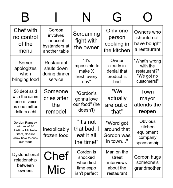 This bingo card has a free space and 24 words: Inexplicably frozen food, Chef Mic, "It's impossible to make X fresh every day", Dysfunctional relationship between owners, Owners who should not have bought a restaurant, Chef with no control of the menu, Server apologizes when bringing food, Gordon involves innocent bystanders at another table, "We actually are out of that", "It's not that bad, I eat it all the time!", Owner clearly in denial that product is bad, $8 debt said with the same tone of voice as one million dollars debt, "Word got around that Gordon was in town...", Obvious kitchen equipment company sponsorship, Restaurant shuts down during dinner service, Man on the street interviews about the restaurant, Town mayor attends the reopen, Screaming fight with the owner, "What's wrong with the restaurant?" "We got no customers!", Someone cries after the remodel, Gordon hugs someone's grandmother, Gordon Ramsay, winner of 16 lifetime Michelin Stars, doesn't know how to cook our food!, Only one person cooking in the kitchen and Gordon is shocked when first time expo isn't perfect.