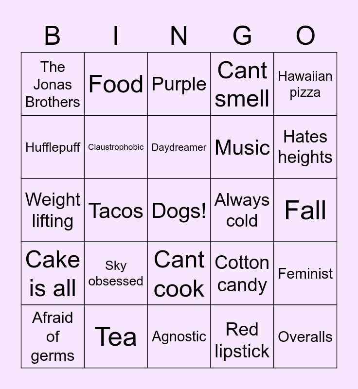 This bingo card has a free space and 24 words: Sky obsessed, Tea, Daydreamer, Afraid of germs, Hawaiian pizza, The Jonas Brothers, Hufflepuff, Food, Always cold, Cant cook, Music, Weight lifting, Cotton candy, Feminist, Claustrophobic, Red lipstick, Fall, Purple, Hates heights, Tacos, Overalls, Cake is all, Cant smell and Agnostic.