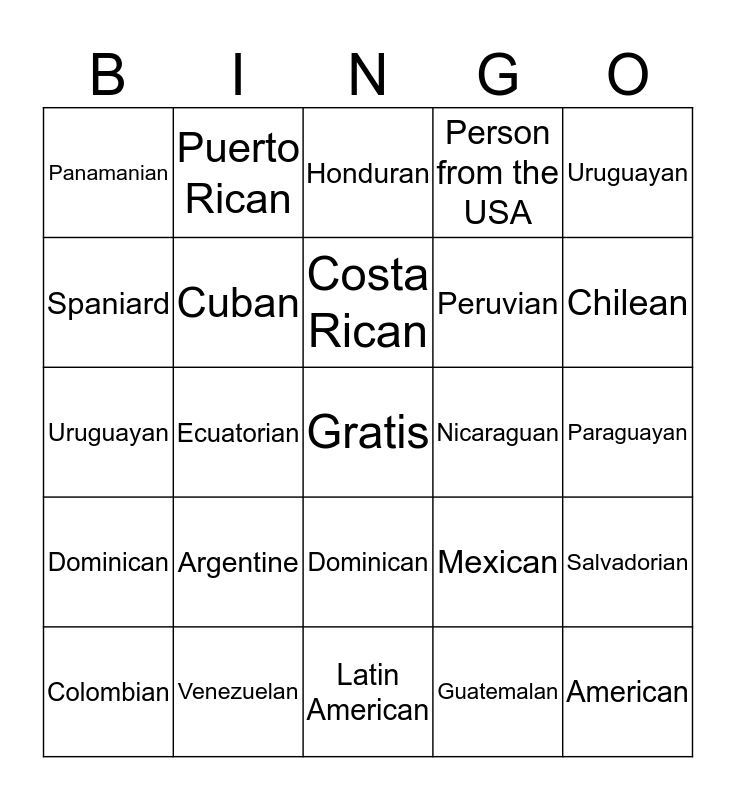 This bingo card has a free space and 24 words: Argentine, Venezuelan, Costa Rican, Colombian, Uruguayan, Panamanian, Spaniard, Puerto Rican, Nicaraguan, Dominican, Peruvian, Uruguayan, Mexican, Salvadorian, Cuban, Guatemalan, Paraguayan, Honduran, Chilean, Ecuatorian, American, Dominican, Person from the USA and Latin American.
