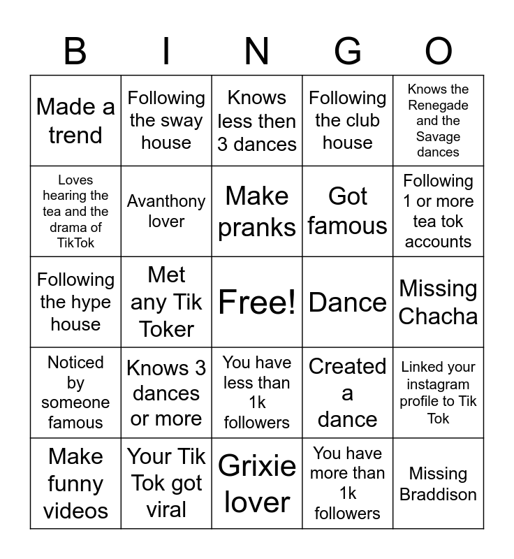 This bingo card has a free space and 24 words: Knows 3 dances or more, Your Tik Tok got viral, Make pranks, Make funny videos, Knows the Renegade and the Savage dances, Made a trend, Loves hearing the tea and the drama of TikTok, Following the sway house, Dance, You have less than 1k followers, Got famous, Following the hype house, Created a dance, Linked your instagram profile to Tik Tok, Avanthony lover, You have more than 1k followers, Missing Chacha, Knows less then 3 dances, Following 1 or more tea tok accounts, Met any Tik Toker, Missing Braddison, Noticed by someone famous, Following the club house and Grixie lover.