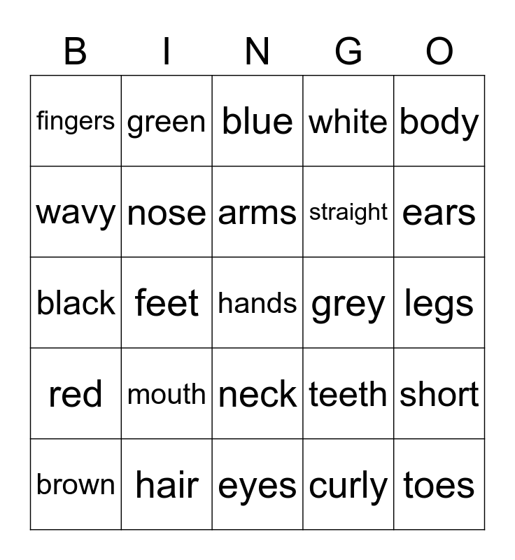 This bingo card has 28 words: short, long, straight, curly, wavy, blue, green, red, grey, brown, black, white, hair, eyes, ears, head, mouth, nose, arms, neck, fingers, toes, hands, feet, legs, teeth, body and face.