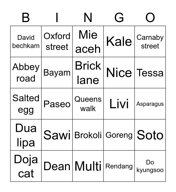This bingo card has a free space and 24 words: Sawi, Dean, Brick lane, Doja cat, Carnaby street, David bechkam, Abbey road, Oxford street, Livi, Brokoli, Nice, Salted egg, Goreng, Soto, Bayam, Rendang, Asparagus, Mie aceh, Tessa, Paseo, Do kyungsoo, Dua lipa, Kale and Multi.