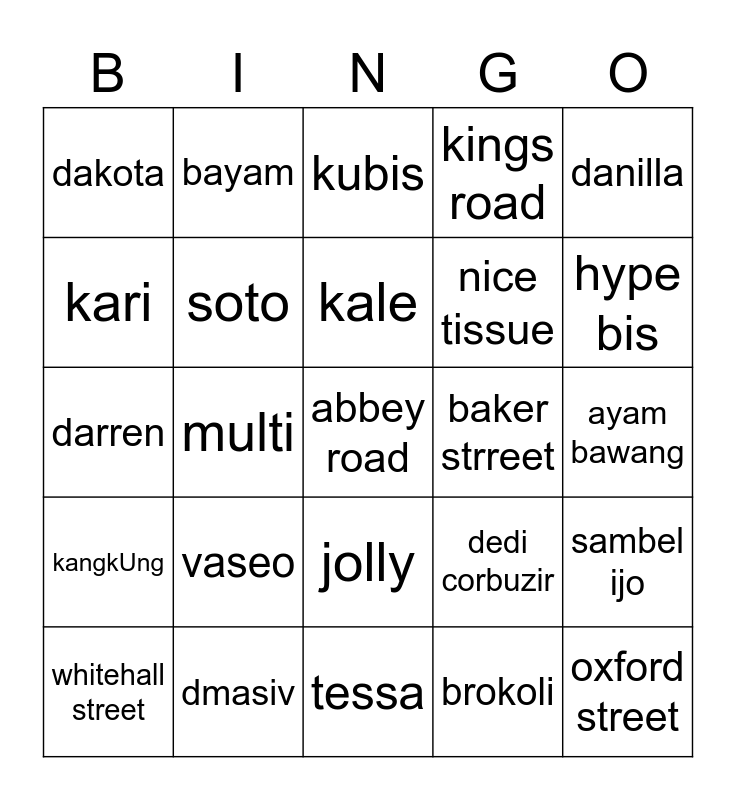 This bingo card has a free space and 24 words: vaseo, dmasiv, kale, whitehall street, danilla, dakota, kari, bayam, baker strreet, jolly, nice tissue, darren, dedi corbuzir, sambel ijo, soto, brokoli, ayam bawang, kubis, hype bis, multi, oxford street, kangkUng, kings road and tessa.