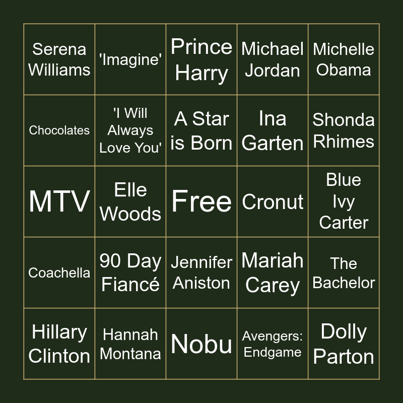 This bingo card has a free space and 63 words: TikTok, Anna Wintour, iPhone, The Bachelor, Cher, The Real Housewives of NYC, 'Imagine', SNL, A Star is Born, Carole Baskin, Jennifer Aniston, Oprah, Blue Ivy Carter, Michelle Obama, Andy Warhol, Chocolates, Elle Woods, Serena Williams, Netflix, Ina Garten, 90 Day Fiancé, Coachella, Michael Jordan, Ariana Grande, Paris Hilton, Bradley Cooper, Martha Stewart, Tom Hanks, Shirley Crisholm, Katy Perry, Simone Biles, Kim Kardashian West, Ginni Rommety, RuPaul, Shonda Rhimes, Hillary Clinton, Tina Fey, Avengers: Endgame, Social Media Influencer, 'I Will Always Love You', MTV, Cronut, Starbucks, Madonna, Dolly Parton, Hannah Montana, Kelly Clarkson, Mariah Carey, Titanic, A League of Their Own, Romy and Michele's High School Reunion, Nobu, Mickey Mouse Club, "YOLO", E! News, Prince Harry, JLo, NYFW, Star Wars, AOL Instant Messenger, Beer, Modern Family and The Academy Awards.