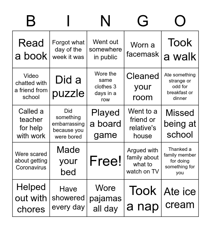 This bingo card has 26 words: Free!, Took a nap, Wore the same clothes 3 days in a row, Have showered every day, Took a walk, Read a book, Video chatted with a friend from school, Forgot what day of the week it was, Missed being at school, Argued with family about what to watch on TV, Cleaned your room, Called a teacher for help with work, Thanked a family member for doing something for you, Helped out with chores, Did something embarrassing because you were bored, Learned something new/started new hobby, Worn a facemask, Were scared about getting Coronavirus, Went out somewhere in public, Played a board game, Ate something strange or odd for breakfast or dinner, Wore pajamas all day, Went to a friend or relative's house, Made your bed, Did a puzzle and Ate ice cream.