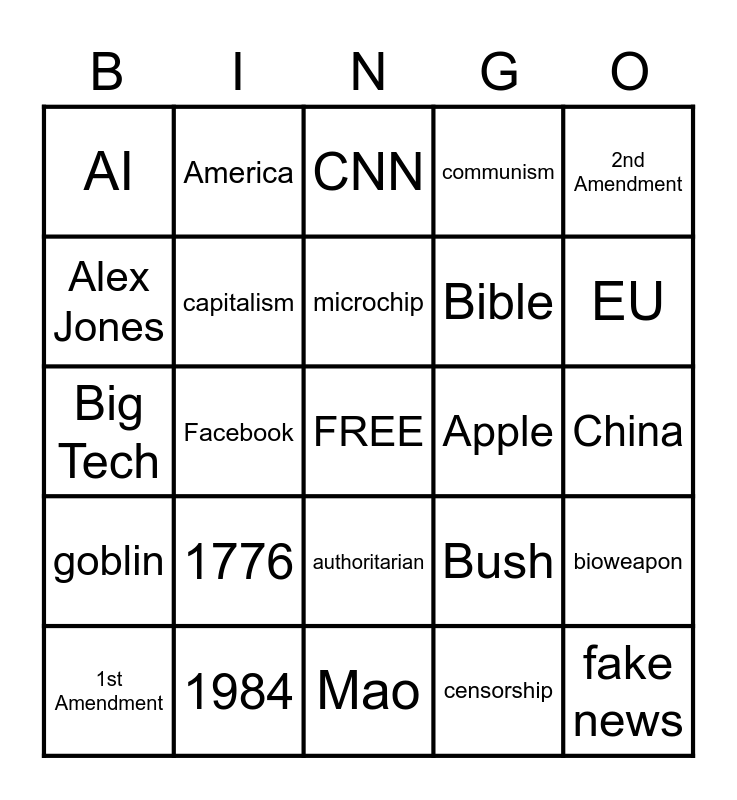 This bingo card has a free space and 24 words: 1776, 1984, microchip, 1st Amendment, 2nd Amendment, AI, Alex Jones, America, Apple, authoritarian, Bible, Big Tech, Bush, bioweapon, capitalism, censorship, China, CNN, EU, Facebook, fake news, goblin, communism and Mao.
