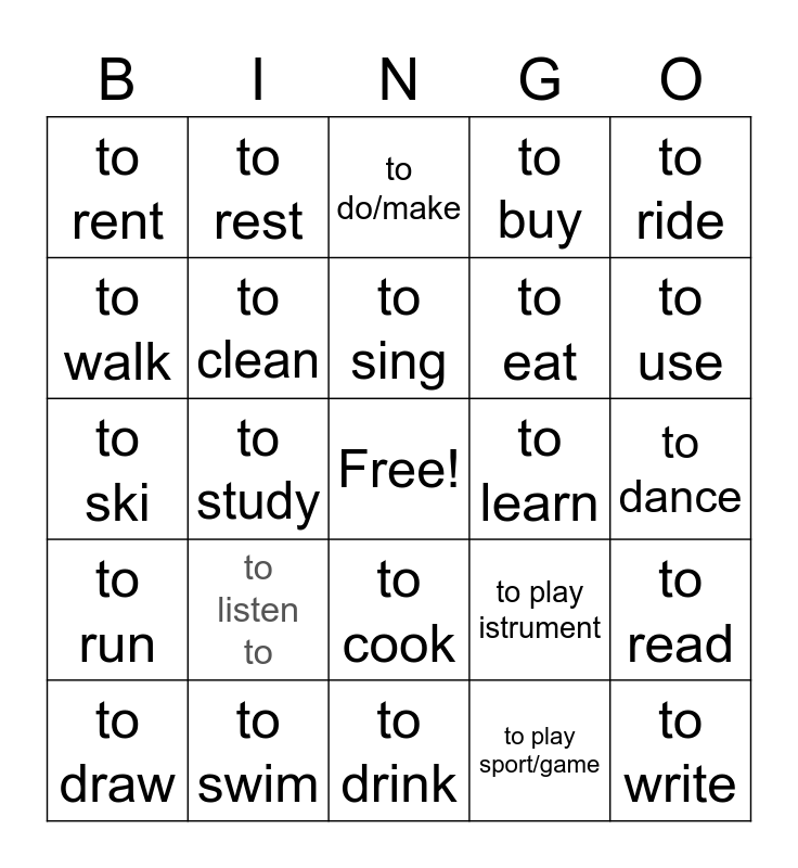 This bingo card has a free space and 24 words: to listen to, to swim, to sing, to draw, to ride, to rent, to walk, to rest, to learn, to cook, to eat, to ski, to play istrument, to read, to clean, to play sport/game, to dance, to do/make, to use, to study, to write, to run, to buy and to drink.