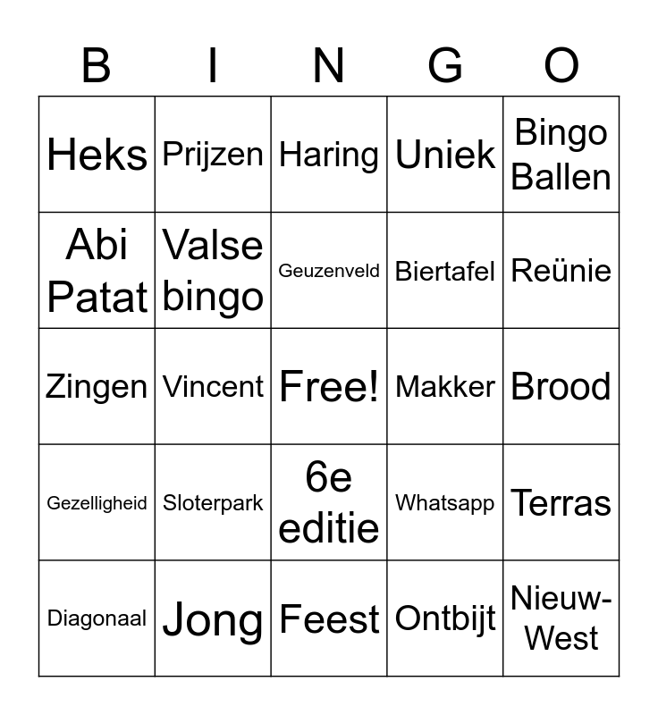 This bingo card has a free space and 75 words: Buurtcamping, Buurtbuik, Haring, Kampvuur, Scheerlijn, Wc-rol, Hamsteren, Afwas, Tent, Natureluur, The Voice of the Buurtcamping, Slotermeer, Geuzenveld, Abi Patat, Mystic Garden, Vincent, Esther, Nieuw-West, Amsterdam, Bingo Ballen, Liedje, Zingen, Valse bingo, Prijzen, Uniek, Uitzonderlijk, Quarantaine, Anderhalve meter, Het nieuwe normaal, Mei, Zoom, Teams, Facebook, Whatsapp, Reünie, Biertafel, Bier, Wijn, Brood, Ontbijt, Lunch, Avondeten, Rijtje, Lijntje, Horizontaal, Verticaal, Diagonaal, Heks, Wilde chefs, Verbinding, Kampeerders, 6e editie, Ondernemers, Fantastisch, Stadsdeel, Stadsdeelvoorzitter, Sponsoren, Fonds Nieuw-West, Klusdag, Noorderhof, Sloterpark, Vrijwilligers, Reserveren, Gezondheid, Proost, Makker, Duimen omhoog, Barbecue, Standje, Terras, Gezelligheid, Jong, Oud, Feest and Klaar.