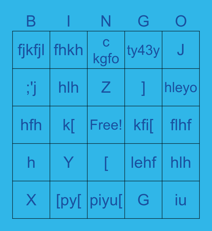 This bingo card has a free space and 24 words: X, Y, Z, G, J, fjkfjl, fhkh, c kgfo, kfi[, flhf, hfh, hlh, lehf, hlh, ;'j, [py[, piyu[, ty43y, hleyo, h, k[, [, ] and iu.