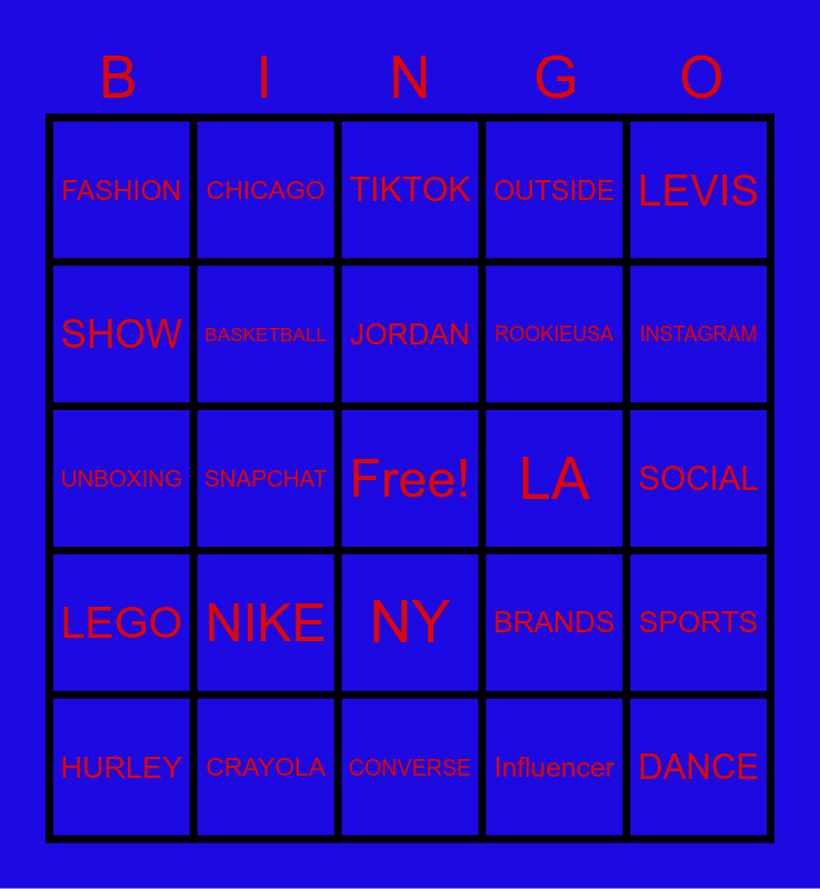 This bingo card has a free space and 25 words: NIKE, CONVERSE, JORDAN, HURLEY, LEVIS, FASHION, SHOW, CHICAGO, LA, NY, ROOKIEUSA, UNBOXING, BRANDS, SPORTS, BASKETBALL, MICHAELJORDAN, SOCIAL, TIKTOK, INSTAGRAM, SNAPCHAT, DANCE, CRAYOLA, LEGO, OUTSIDE and Influencer.