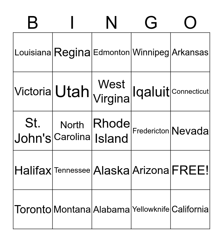 This bingo card has 28 words: FREE!, Whitehorse, Iqaluit, Yellowknife, Victoria, Edmonton, Regina, Halifax, Fredericton, Toronto, St. John's, Winnipeg, Montana, Alabama, Connecticut, Georgia, Tennessee, Utah, West Virgina, Alaska, Louisiana, California, Rhode Island, North Carolina, Nevada, Arizona, Arkansas and Colorado.