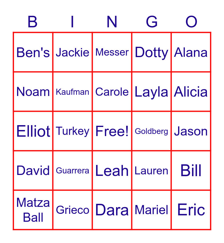 This bingo card has a free space and 29 words: Matza Ball, Brisket, Turkey, Knish, Ben's, Messer, Kaufman, Guarrera, Goldberg, Grieco, Jason, Eric, Dara, Mariel, Alicia, Seth, Leah, David, Alana, Elliot, Lauren, Sam, Layla, Noam, Dotty, Jackie, Bill, Carole and Vin.