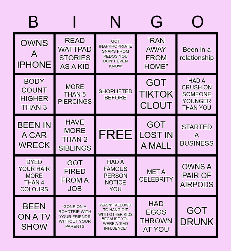 This bingo card has a free space and 24 words: GOT FIRED FROM A JOB, GONE ON A ROADTRIP WITH YOUR FRIENDS WITHOUT YOUR PARENTS, SHOPLIFTED BEFORE, BEEN ON A TV SHOW, Been in a relationship, OWNS A IPHONE, BODY COUNT HIGHER THAN 3, READ WATTPAD STORIES AS A KID, GOT LOST IN A MALL, HAD A FAMOUS PERSON NOTICE YOU, GOT TIKTOK CLOUT, BEEN IN A CAR WRECK, MET A CELEBRITY, OWNS A PAIR OF AIRPODS, MORE THAN 5 PIERCINGS, HAD EGGS THROWN AT YOU, STARTED A BUSINESS, GOT INAPPROPRIATE SNAPS FROM PEDOS YOU DON’T EVEN KNOW, HAD A CRUSH ON SOMEONE YOUNGER THAN YOU, HAVE MORE THAN 2 SIBLINGS, GOT DRUNK, DYED YOUR HAIR MORE THAN 4 COLOURS, “RAN AWAY FROM HOME” and WASN'T ALLOWD TO HANG OIT WITH OTHER KIDS BECAUSE YOU WERE A “BAD INFLUENCE”.